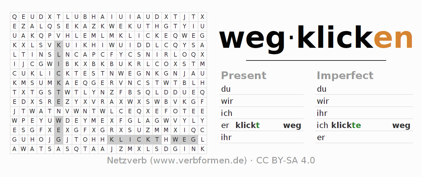 The word search puzzle for wegklicken or short word search is used to playfully learn German conjugation. First of all, the individual verb forms of the verb wegklicken must be created in order to find them in the letter grid. The reverse way is also possible. If one finds a flected verb in the search word puzzle, it is necessary to find out which verb form can be assigned. For printing and downloading, there is a PDF version or an image. There are also many more worksheets for the verb wegklicken. All materials are available as Open Educational Resources (OER) under license CC BY- SA 4.0 and can be used free of charge.