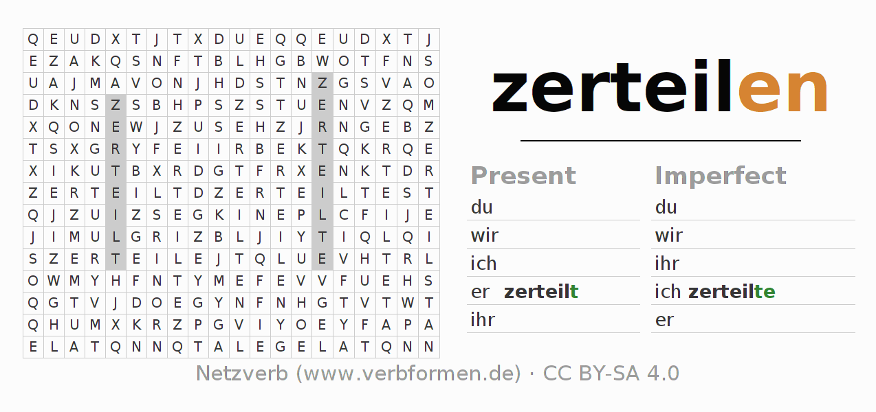 The word search puzzle for zerteilen or short word search is used to playfully learn German conjugation. First of all, the individual verb forms of the verb zerteilen must be created in order to find them in the letter grid. The reverse way is also possible. If one finds a flected verb in the search word puzzle, it is necessary to find out which verb form can be assigned. For printing and downloading, there is a PDF version or an image. There are also many more worksheets for the verb zerteilen. All materials are available as Open Educational Resources (OER) under license CC BY- SA 4.0 and can be used free of charge.