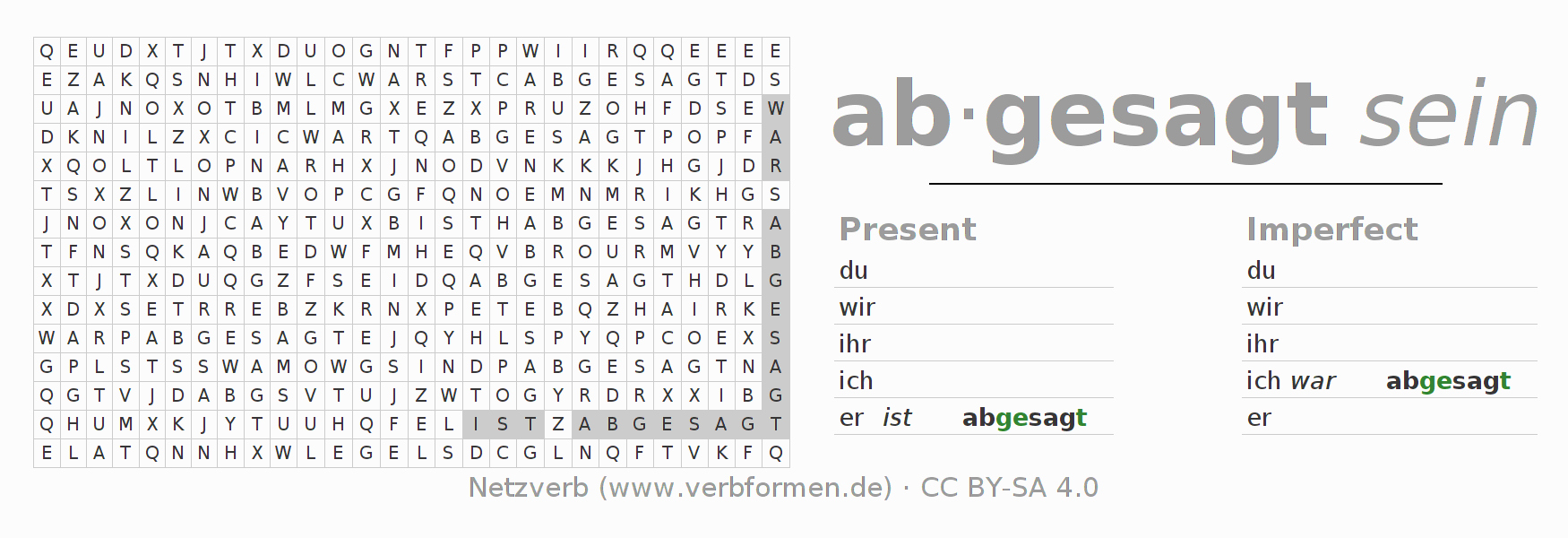 Instruction: Form the verb absagen and find it in the puzzle. Or recognize the flected form of absagen in the riddle and assign it to the correct verb form. Umlauts and ß are described as oe, ae and ue an ss.The solution is at the bottom of the page.