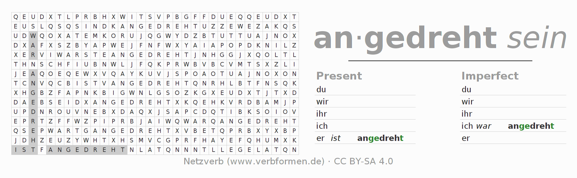The word search puzzle for andrehen or short word search is used to playfully learn German conjugation. First of all, the individual verb forms of the verb andrehen must be created in order to find them in the letter grid. The reverse way is also possible. If one finds a flected verb in the search word puzzle, it is necessary to find out which verb form can be assigned. For printing and downloading, there is a PDF version or an image. There are also many more worksheets for the verb andrehen. All materials are available as Open Educational Resources (OER) under license CC BY- SA 4.0 and can be used free of charge.