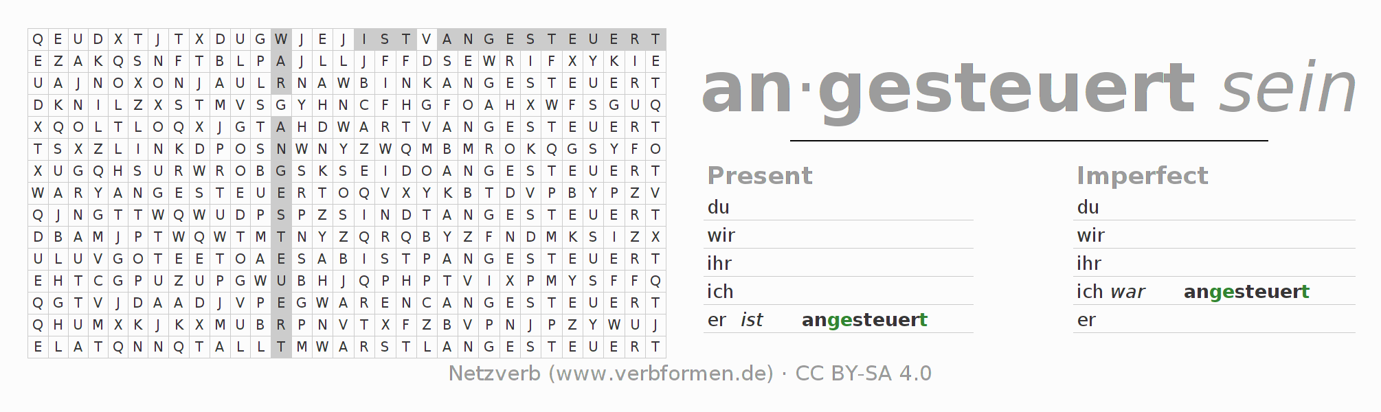 The word search puzzle for ansteuern or short word search is used to playfully learn German conjugation. First of all, the individual verb forms of the verb ansteuern must be created in order to find them in the letter grid. The reverse way is also possible. If one finds a flected verb in the search word puzzle, it is necessary to find out which verb form can be assigned. For printing and downloading, there is a PDF version or an image. There are also many more worksheets for the verb ansteuern. All materials are available as Open Educational Resources (OER) under license CC BY- SA 4.0 and can be used free of charge.