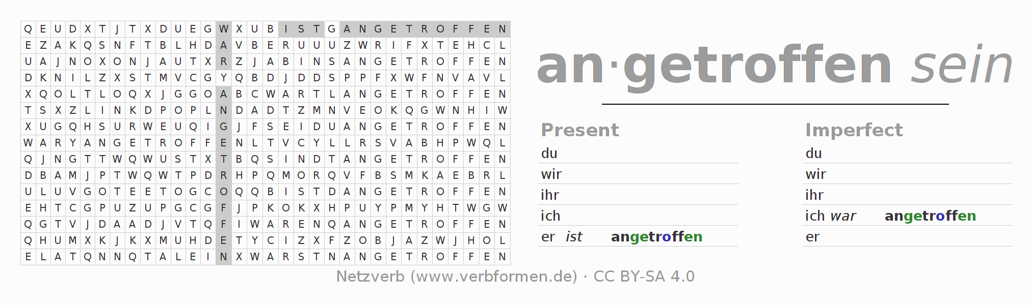 The word search puzzle for antreffen or short word search is used to playfully learn German conjugation. First of all, the individual verb forms of the verb antreffen must be created in order to find them in the letter grid. The reverse way is also possible. If one finds a flected verb in the search word puzzle, it is necessary to find out which verb form can be assigned. For printing and downloading, there is a PDF version or an image. There are also many more worksheets for the verb antreffen. All materials are available as Open Educational Resources (OER) under license CC BY- SA 4.0 and can be used free of charge.