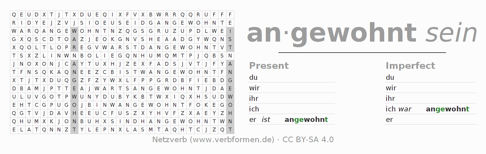 The word search puzzle for anwohnen or short word search is used to playfully learn German conjugation. First of all, the individual verb forms of the verb anwohnen must be created in order to find them in the letter grid. The reverse way is also possible. If one finds a flected verb in the search word puzzle, it is necessary to find out which verb form can be assigned. For printing and downloading, there is a PDF version or an image. There are also many more worksheets for the verb anwohnen. All materials are available as Open Educational Resources (OER) under license CC BY- SA 4.0 and can be used free of charge.