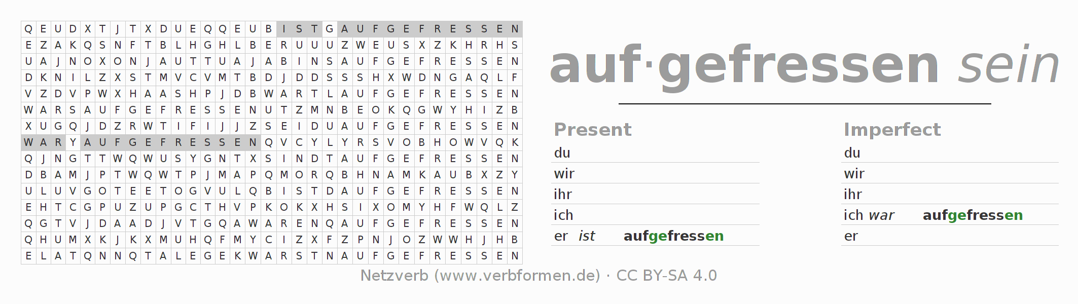 The word search puzzle for auffressen or short word search is used to playfully learn German conjugation. First of all, the individual verb forms of the verb auffressen must be created in order to find them in the letter grid. The reverse way is also possible. If one finds a flected verb in the search word puzzle, it is necessary to find out which verb form can be assigned. For printing and downloading, there is a PDF version or an image. There are also many more worksheets for the verb auffressen. All materials are available as Open Educational Resources (OER) under license CC BY- SA 4.0 and can be used free of charge.