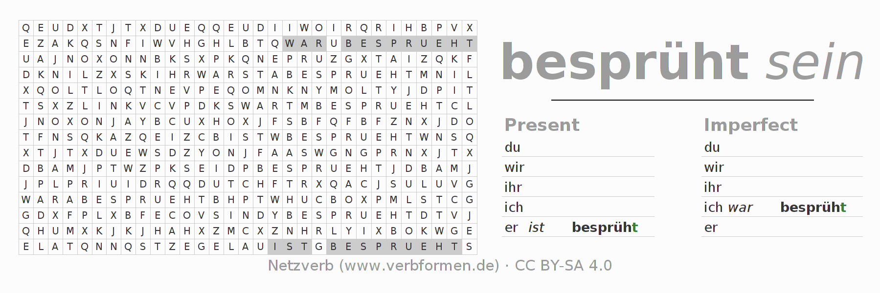 The word search puzzle for besprühen or short word search is used to playfully learn German conjugation. First of all, the individual verb forms of the verb besprühen must be created in order to find them in the letter grid. The reverse way is also possible. If one finds a flected verb in the search word puzzle, it is necessary to find out which verb form can be assigned. For printing and downloading, there is a PDF version or an image. There are also many more worksheets for the verb besprühen. All materials are available as Open Educational Resources (OER) under license CC BY- SA 4.0 and can be used free of charge.