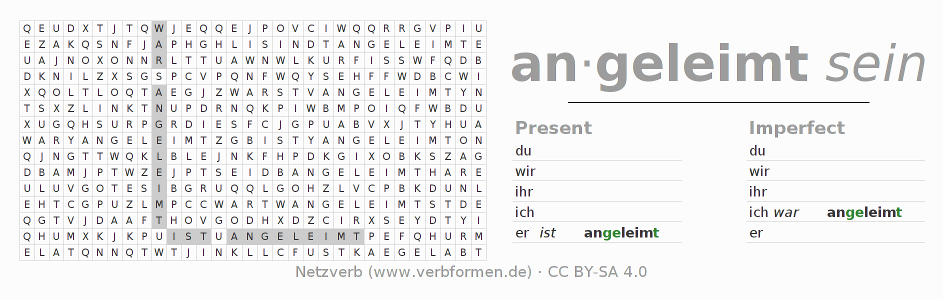 The word search puzzle for anleimen or short word search is used to playfully learn German conjugation. First of all, the individual verb forms of the verb anleimen must be created in order to find them in the letter grid. The reverse way is also possible. If one finds a flected verb in the search word puzzle, it is necessary to find out which verb form can be assigned. For printing and downloading, there is a PDF version or an image. There are also many more worksheets for the verb anleimen. All materials are available as Open Educational Resources (OER) under license CC BY- SA 4.0 and can be used free of charge.
