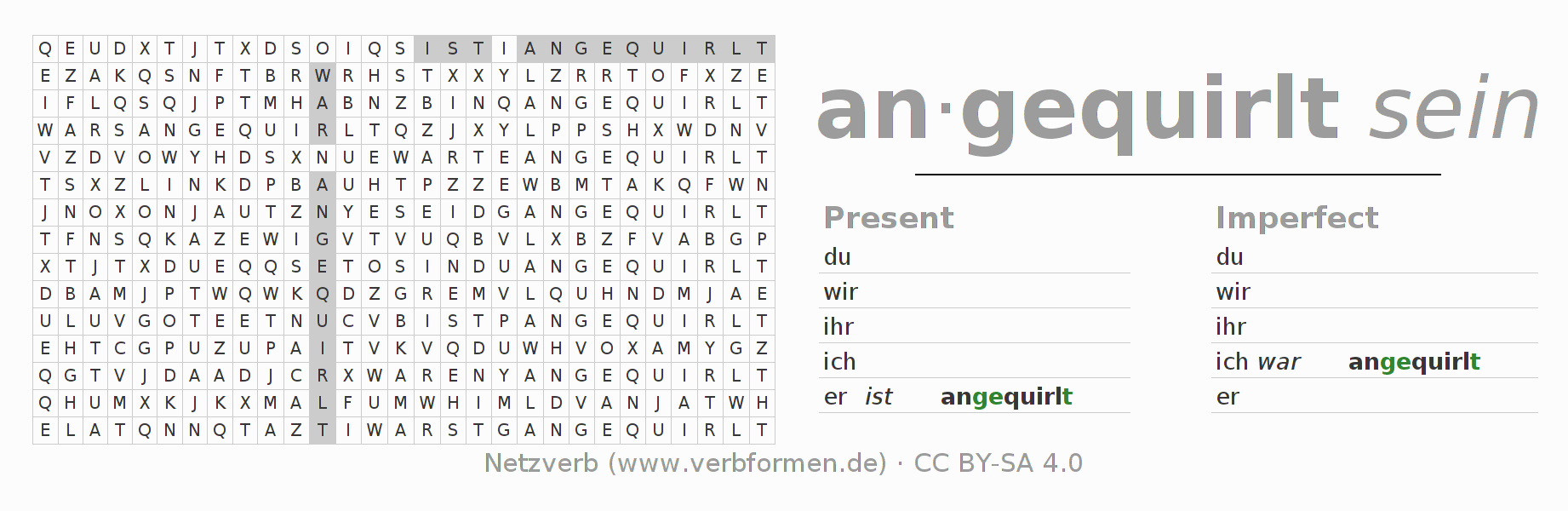The word search puzzle for anquirlen or short word search is used to playfully learn German conjugation. First of all, the individual verb forms of the verb anquirlen must be created in order to find them in the letter grid. The reverse way is also possible. If one finds a flected verb in the search word puzzle, it is necessary to find out which verb form can be assigned. For printing and downloading, there is a PDF version or an image. There are also many more worksheets for the verb anquirlen. All materials are available as Open Educational Resources (OER) under license CC BY- SA 4.0 and can be used free of charge.