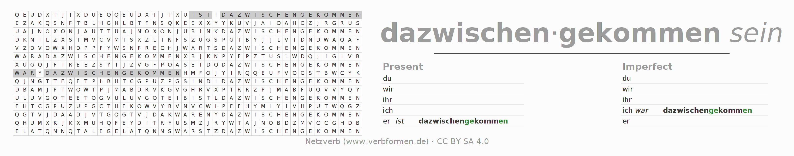 The word search puzzle for dazwischenkommen or short word search is used to playfully learn German conjugation. First of all, the individual verb forms of the verb dazwischenkommen must be created in order to find them in the letter grid. The reverse way is also possible. If one finds a flected verb in the search word puzzle, it is necessary to find out which verb form can be assigned. For printing and downloading, there is a PDF version or an image. There are also many more worksheets for the verb dazwischenkommen. All materials are available as Open Educational Resources (OER) under license CC BY- SA 4.0 and can be used free of charge.