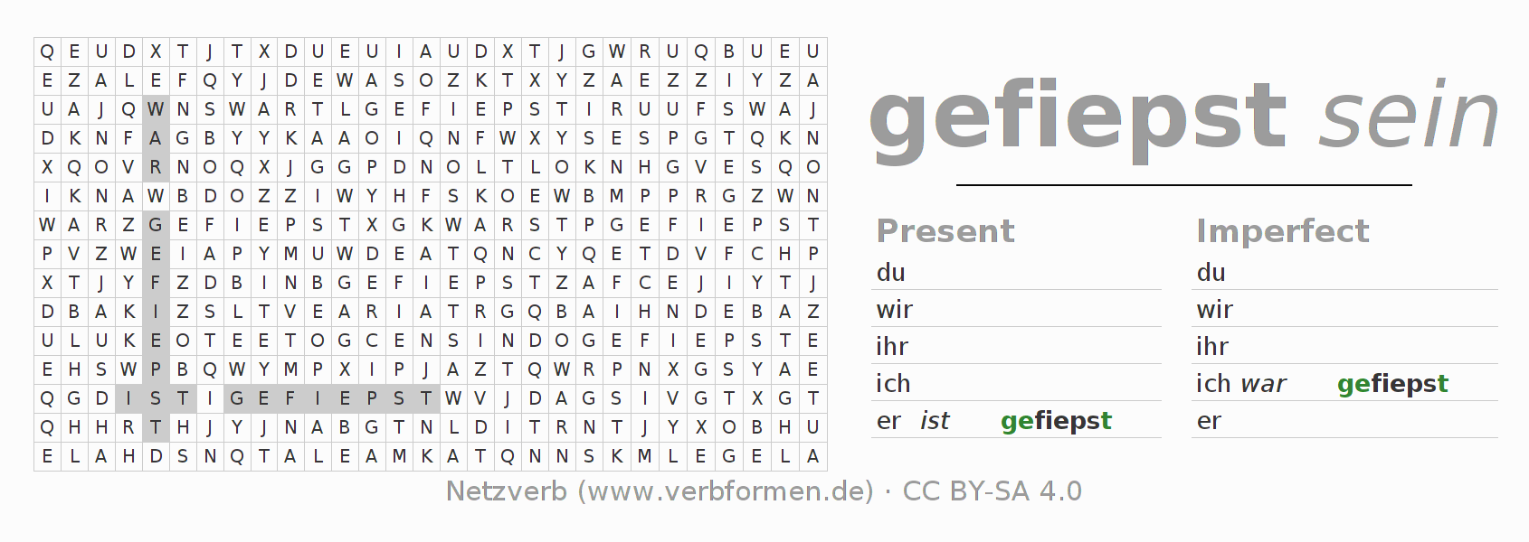 Instruction: Form the verb fiepsen and find it in the puzzle. Or recognize the flected form of fiepsen in the riddle and assign it to the correct verb form. Umlauts and ß are described as oe, ae and ue an ss.The solution is at the bottom of the page.