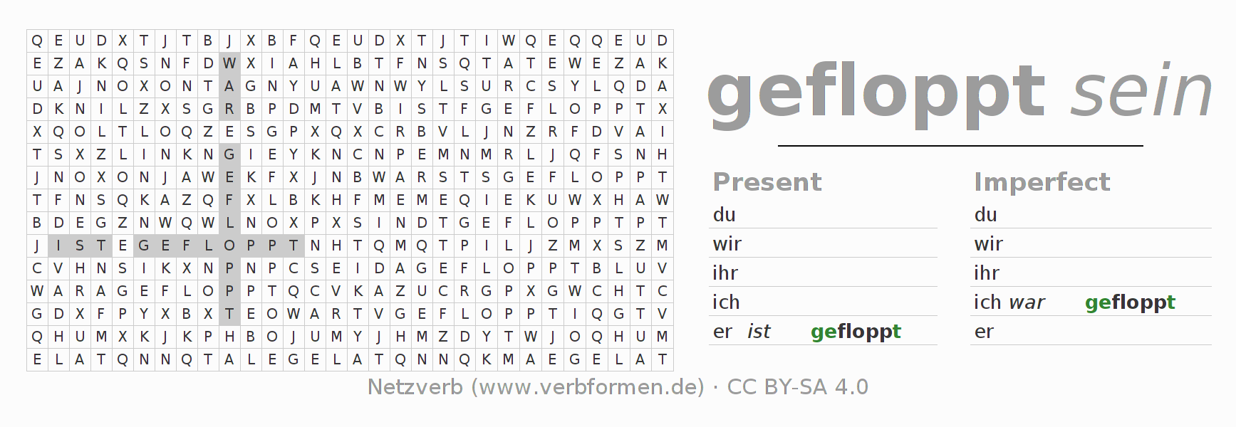 Instruction: Form the verb floppen and find it in the puzzle. Or recognize the flected form of floppen in the riddle and assign it to the correct verb form. Umlauts and ß are described as oe, ae and ue an ss.The solution is at the bottom of the page.