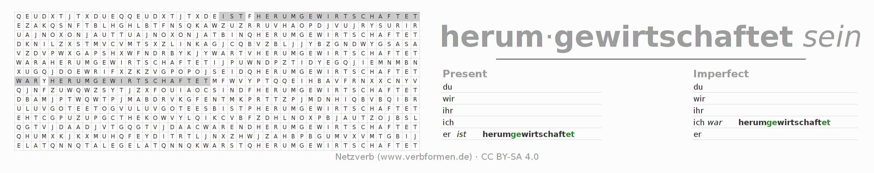 The word search puzzle for herumwirtschaften or short word search is used to playfully learn German conjugation. First of all, the individual verb forms of the verb herumwirtschaften must be created in order to find them in the letter grid. The reverse way is also possible. If one finds a flected verb in the search word puzzle, it is necessary to find out which verb form can be assigned. For printing and downloading, there is a PDF version or an image. There are also many more worksheets for the verb herumwirtschaften. All materials are available as Open Educational Resources (OER) under license CC BY- SA 4.0 and can be used free of charge.