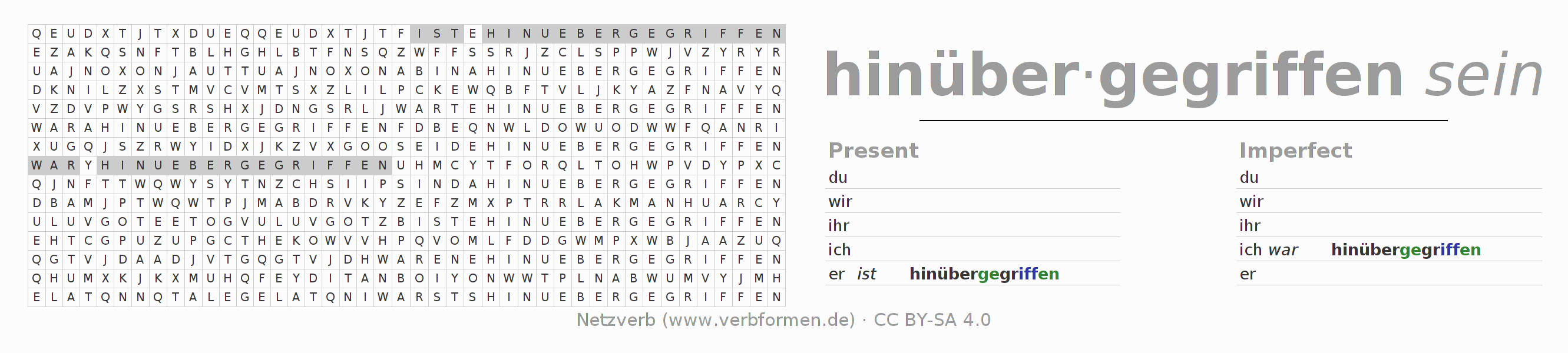 The word search puzzle for hinübergreifen or short word search is used to playfully learn German conjugation. First of all, the individual verb forms of the verb hinübergreifen must be created in order to find them in the letter grid. The reverse way is also possible. If one finds a flected verb in the search word puzzle, it is necessary to find out which verb form can be assigned. For printing and downloading, there is a PDF version or an image. There are also many more worksheets for the verb hinübergreifen. All materials are available as Open Educational Resources (OER) under license CC BY- SA 4.0 and can be used free of charge.