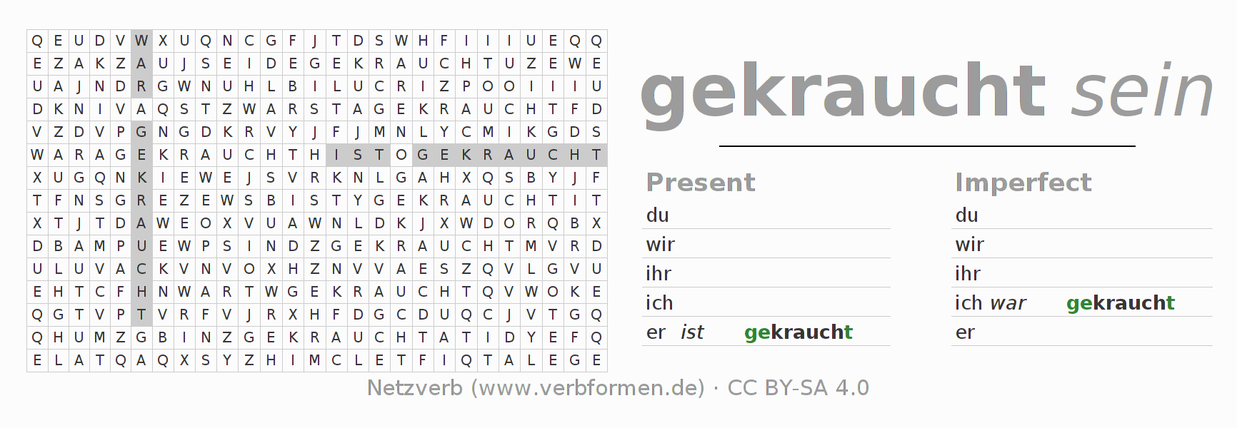 The word search puzzle for krauchen or short word search is used to playfully learn German conjugation. First of all, the individual verb forms of the verb krauchen (regelm) must be created in order to find them in the letter grid. The reverse way is also possible. If one finds a flected verb in the search word puzzle, it is necessary to find out which verb form can be assigned. For printing and downloading, there is a PDF version or an image. There are also many more worksheets for the verb krauchen. All materials are available as Open Educational Resources (OER) under license CC BY- SA 4.0 and can be used free of charge.