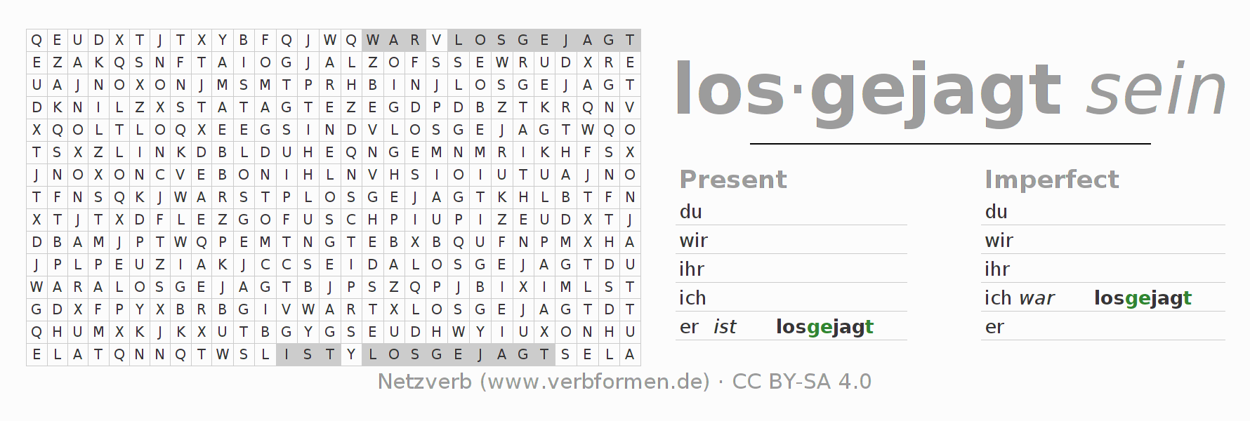 The word search puzzle for losjagen or short word search is used to playfully learn German conjugation. First of all, the individual verb forms of the verb losjagen (ist) must be created in order to find them in the letter grid. The reverse way is also possible. If one finds a flected verb in the search word puzzle, it is necessary to find out which verb form can be assigned. For printing and downloading, there is a PDF version or an image. There are also many more worksheets for the verb losjagen. All materials are available as Open Educational Resources (OER) under license CC BY- SA 4.0 and can be used free of charge.