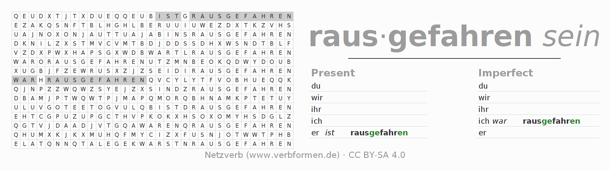 The word search puzzle for rausfahren or short word search is used to playfully learn German conjugation. First of all, the individual verb forms of the verb rausfahren (ist) must be created in order to find them in the letter grid. The reverse way is also possible. If one finds a flected verb in the search word puzzle, it is necessary to find out which verb form can be assigned. For printing and downloading, there is a PDF version or an image. There are also many more worksheets for the verb rausfahren. All materials are available as Open Educational Resources (OER) under license CC BY- SA 4.0 and can be used free of charge.