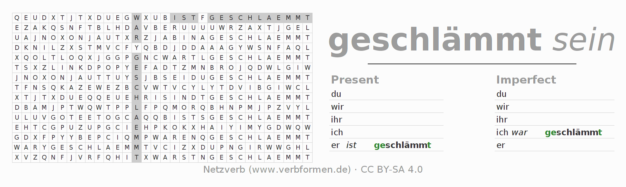 Instruction: Form the verb schlämmen and find it in the puzzle. Or recognize the flected form of schlämmen in the riddle and assign it to the correct verb form. Umlauts and ß are described as oe, ae and ue an ss.The solution is at the bottom of the page.
