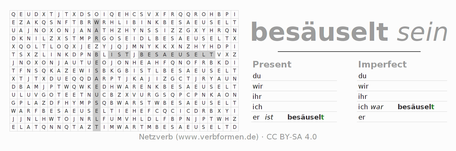 The word search puzzle for besäuseln or short word search is used to playfully learn German conjugation. First of all, the individual verb forms of the verb sich besäuseln must be created in order to find them in the letter grid. The reverse way is also possible. If one finds a flected verb in the search word puzzle, it is necessary to find out which verb form can be assigned. For printing and downloading, there is a PDF version or an image. There are also many more worksheets for the verb besäuseln. All materials are available as Open Educational Resources (OER) under license CC BY- SA 4.0 and can be used free of charge.