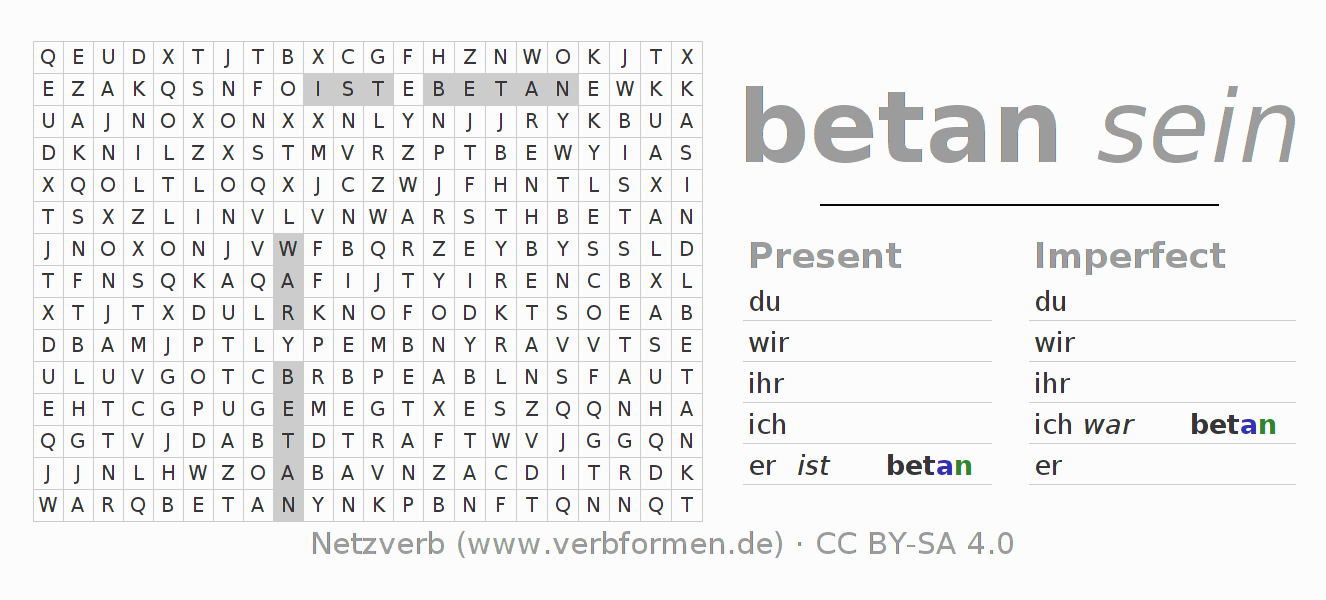 The word search puzzle for betun or short word search is used to playfully learn German conjugation. First of all, the individual verb forms of the verb sich betun must be created in order to find them in the letter grid. The reverse way is also possible. If one finds a flected verb in the search word puzzle, it is necessary to find out which verb form can be assigned. For printing and downloading, there is a PDF version or an image. There are also many more worksheets for the verb betun. All materials are available as Open Educational Resources (OER) under license CC BY- SA 4.0 and can be used free of charge.