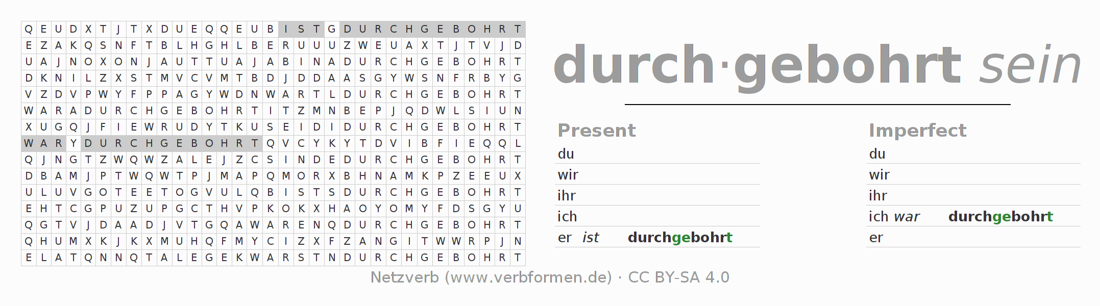 The word search puzzle for durchbohren or short word search is used to playfully learn German conjugation. First of all, the individual verb forms of the verb sich durch-bohren must be created in order to find them in the letter grid. The reverse way is also possible. If one finds a flected verb in the search word puzzle, it is necessary to find out which verb form can be assigned. For printing and downloading, there is a PDF version or an image. There are also many more worksheets for the verb durchbohren. All materials are available as Open Educational Resources (OER) under license CC BY- SA 4.0 and can be used free of charge.
