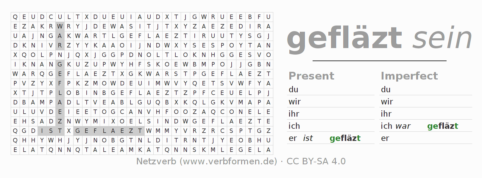 The word search puzzle for fläzen or short word search is used to playfully learn German conjugation. First of all, the individual verb forms of the verb sich fläzen must be created in order to find them in the letter grid. The reverse way is also possible. If one finds a flected verb in the search word puzzle, it is necessary to find out which verb form can be assigned. For printing and downloading, there is a PDF version or an image. There are also many more worksheets for the verb fläzen. All materials are available as Open Educational Resources (OER) under license CC BY- SA 4.0 and can be used free of charge.