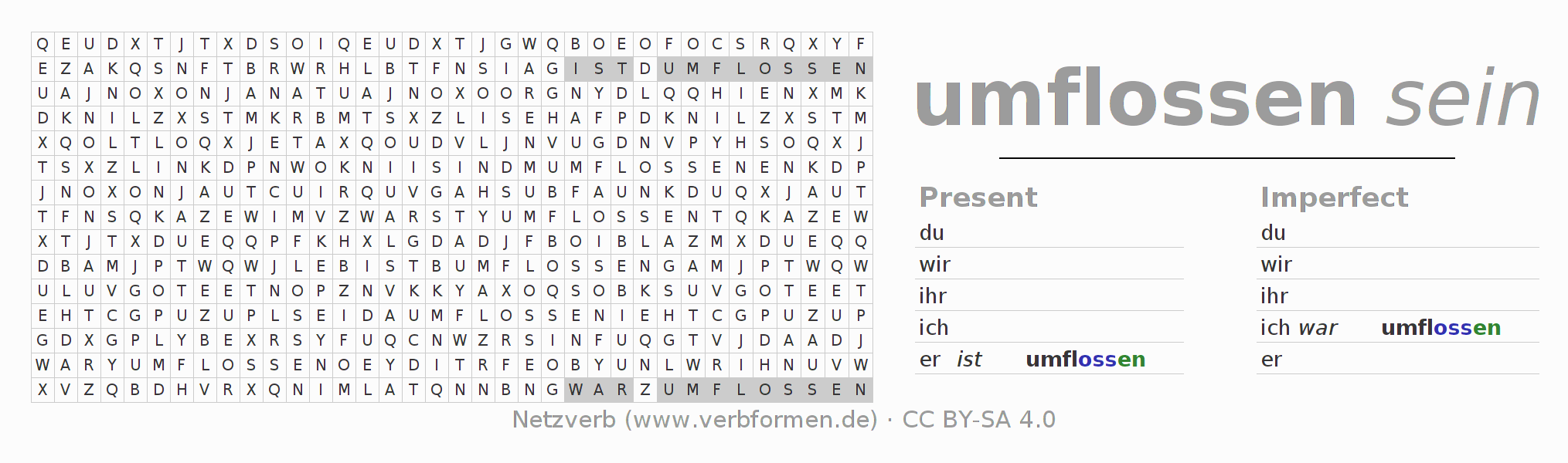 The word search puzzle for umfließen or short word search is used to playfully learn German conjugation. First of all, the individual verb forms of the verb umfließen must be created in order to find them in the letter grid. The reverse way is also possible. If one finds a flected verb in the search word puzzle, it is necessary to find out which verb form can be assigned. For printing and downloading, there is a PDF version or an image. There are also many more worksheets for the verb umfließen. All materials are available as Open Educational Resources (OER) under license CC BY- SA 4.0 and can be used free of charge.