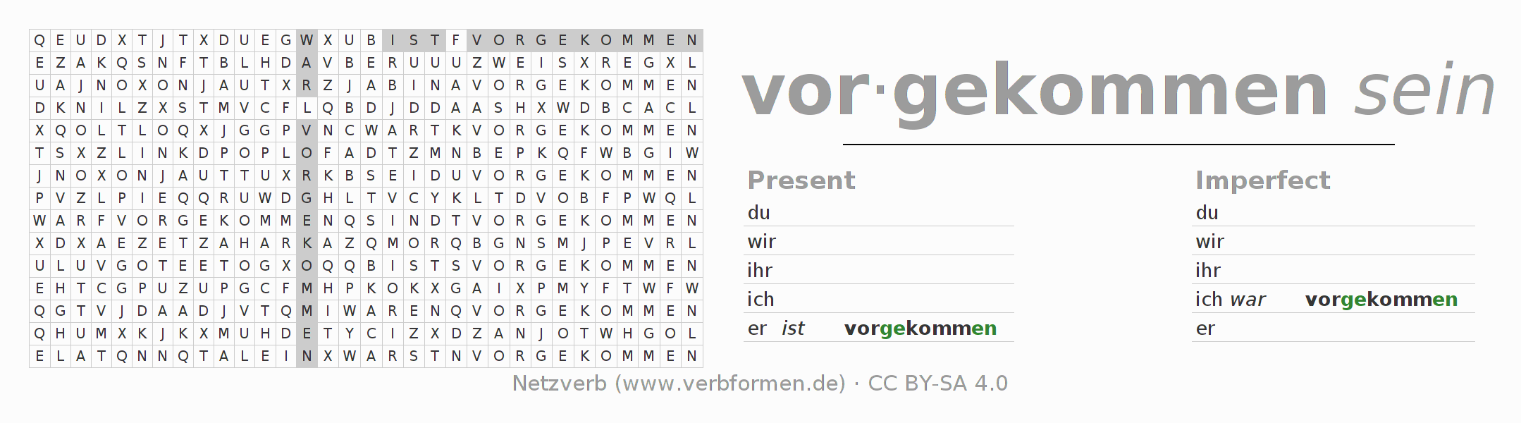 The word search puzzle for vorkommen or short word search is used to playfully learn German conjugation. First of all, the individual verb forms of the verb vorkommen must be created in order to find them in the letter grid. The reverse way is also possible. If one finds a flected verb in the search word puzzle, it is necessary to find out which verb form can be assigned. For printing and downloading, there is a PDF version or an image. There are also many more worksheets for the verb vorkommen. All materials are available as Open Educational Resources (OER) under license CC BY- SA 4.0 and can be used free of charge.