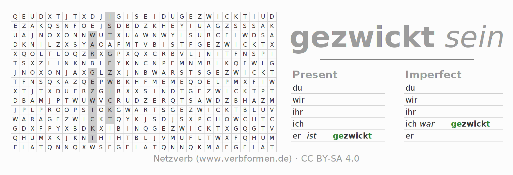 The word search puzzle for zwicken or short word search is used to playfully learn German conjugation. First of all, the individual verb forms of the verb zwicken must be created in order to find them in the letter grid. The reverse way is also possible. If one finds a flected verb in the search word puzzle, it is necessary to find out which verb form can be assigned. For printing and downloading, there is a PDF version or an image. There are also many more worksheets for the verb zwicken. All materials are available as Open Educational Resources (OER) under license CC BY- SA 4.0 and can be used free of charge.