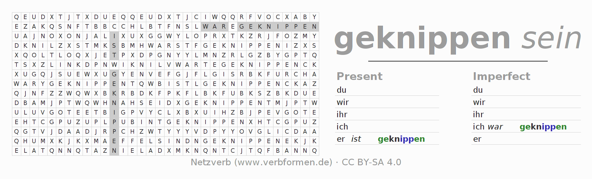 The word search puzzle for kneipen or short word search is used to playfully learn German conjugation. First of all, the individual verb forms of the verb kneipen (unr) must be created in order to find them in the letter grid. The reverse way is also possible. If one finds a flected verb in the search word puzzle, it is necessary to find out which verb form can be assigned. For printing and downloading, there is a PDF version or an image. There are also many more worksheets for the verb kneipen. All materials are available as Open Educational Resources (OER) under license CC BY- SA 4.0 and can be used free of charge.