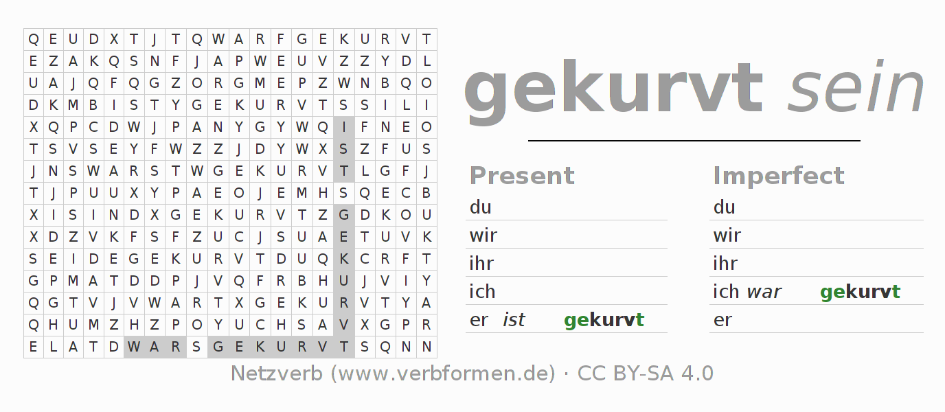 Instruction: Form the verb kurven and find it in the puzzle. Or recognize the flected form of kurven in the riddle and assign it to the correct verb form. Umlauts and ß are described as oe, ae and ue an ss.The solution is at the bottom of the page.