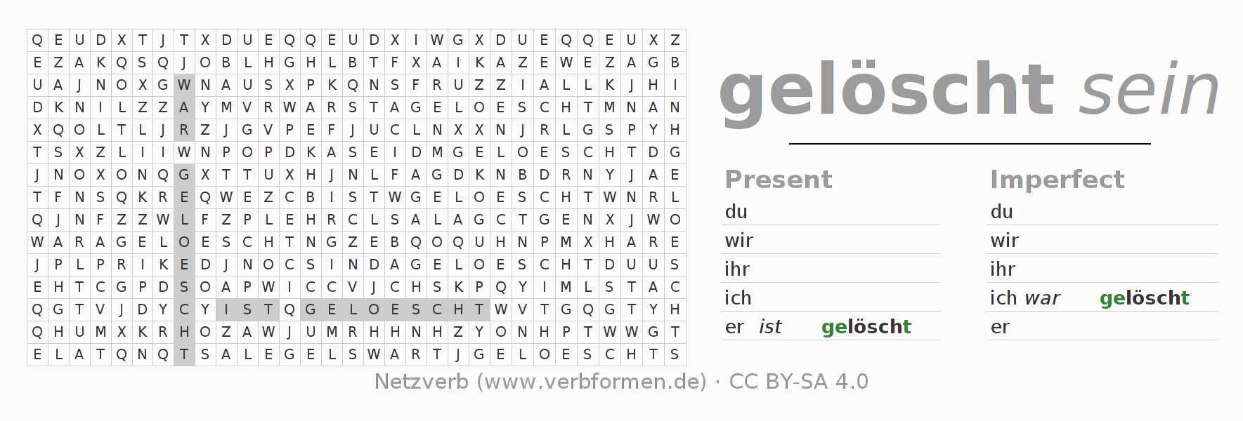 Instruction: Form the verb löschen and find it in the puzzle. Or recognize the flected form of löschen in the riddle and assign it to the correct verb form. Umlauts and ß are described as oe, ae and ue an ss.The solution is at the bottom of the page.