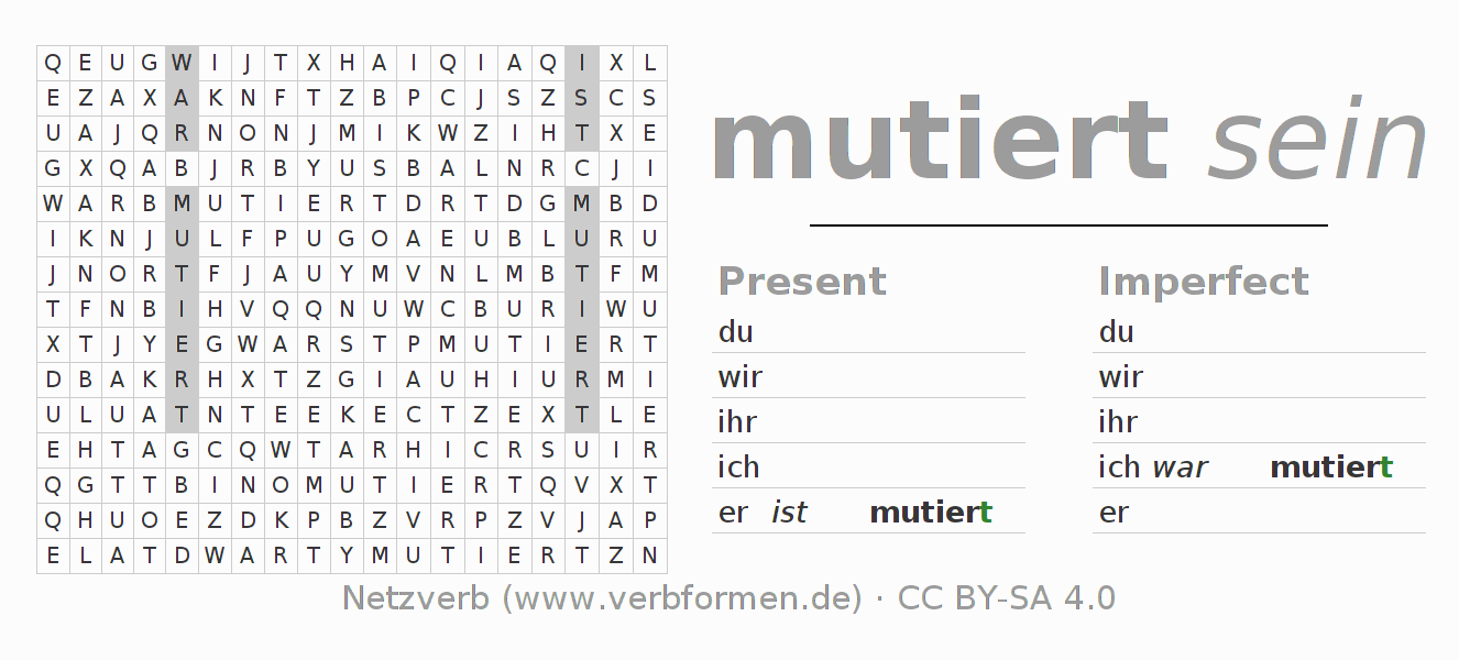 Instruction: Form the verb mutieren and find it in the puzzle. Or recognize the flected form of mutieren in the riddle and assign it to the correct verb form. Umlauts and ß are described as oe, ae and ue an ss.The solution is at the bottom of the page.