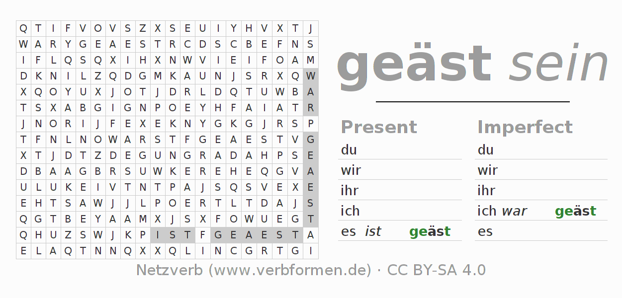 The word search puzzle for äsen or short word search is used to playfully learn German conjugation. First of all, the individual verb forms of the verb äsen must be created in order to find them in the letter grid. The reverse way is also possible. If one finds a flected verb in the search word puzzle, it is necessary to find out which verb form can be assigned. For printing and downloading, there is a PDF version or an image. There are also many more worksheets for the verb äsen. All materials are available as Open Educational Resources (OER) under license CC BY- SA 4.0 and can be used free of charge.