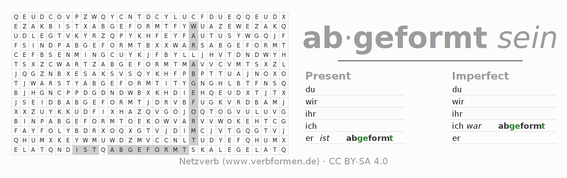 The word search puzzle for abformen or short word search is used to playfully learn German conjugation. First of all, the individual verb forms of the verb abformen must be created in order to find them in the letter grid. The reverse way is also possible. If one finds a flected verb in the search word puzzle, it is necessary to find out which verb form can be assigned. For printing and downloading, there is a PDF version or an image. There are also many more worksheets for the verb abformen. All materials are available as Open Educational Resources (OER) under license CC BY- SA 4.0 and can be used free of charge.
