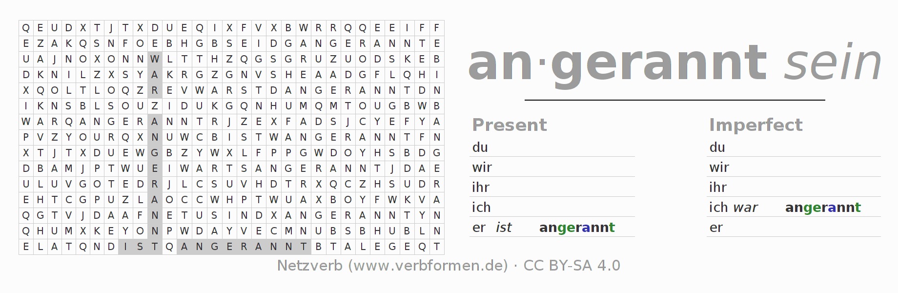 The word search puzzle for anrennen or short word search is used to playfully learn German conjugation. First of all, the individual verb forms of the verb anrennen (hat) must be created in order to find them in the letter grid. The reverse way is also possible. If one finds a flected verb in the search word puzzle, it is necessary to find out which verb form can be assigned. For printing and downloading, there is a PDF version or an image. There are also many more worksheets for the verb anrennen. All materials are available as Open Educational Resources (OER) under license CC BY- SA 4.0 and can be used free of charge.