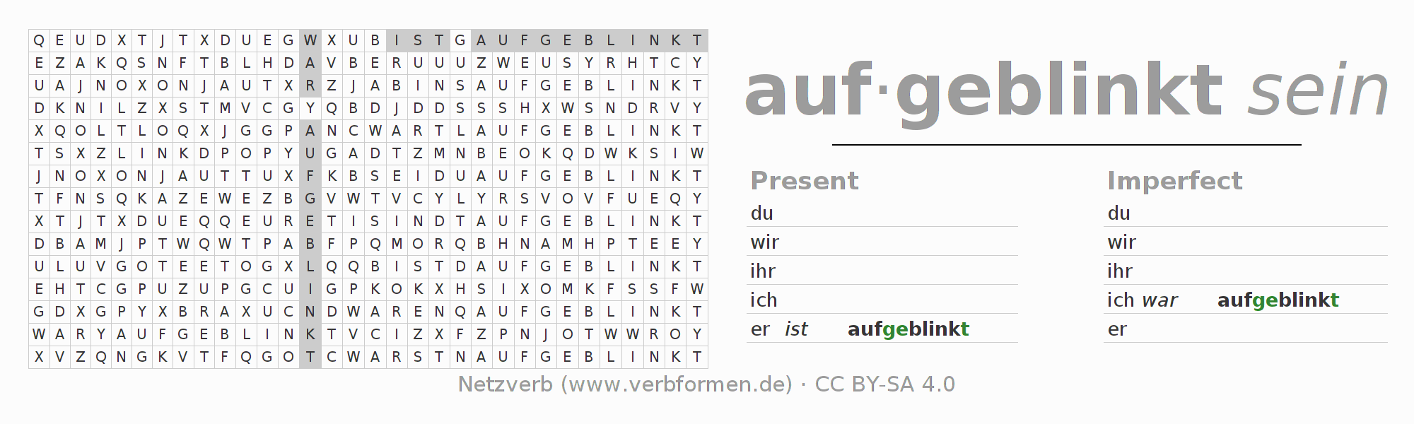 The word search puzzle for aufblinken or short word search is used to playfully learn German conjugation. First of all, the individual verb forms of the verb aufblinken must be created in order to find them in the letter grid. The reverse way is also possible. If one finds a flected verb in the search word puzzle, it is necessary to find out which verb form can be assigned. For printing and downloading, there is a PDF version or an image. There are also many more worksheets for the verb aufblinken. All materials are available as Open Educational Resources (OER) under license CC BY- SA 4.0 and can be used free of charge.