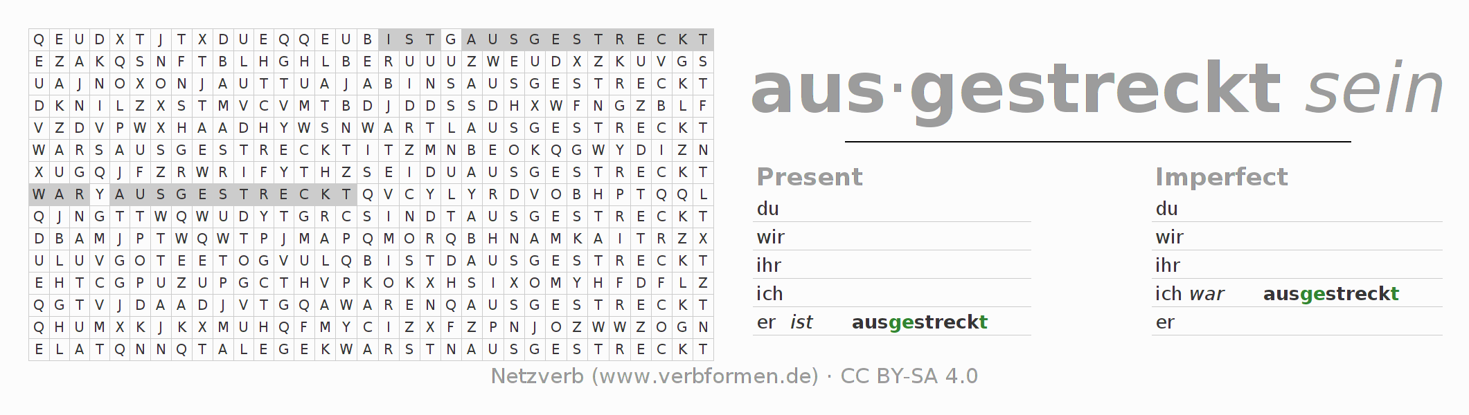 The word search puzzle for ausstrecken or short word search is used to playfully learn German conjugation. First of all, the individual verb forms of the verb ausstrecken must be created in order to find them in the letter grid. The reverse way is also possible. If one finds a flected verb in the search word puzzle, it is necessary to find out which verb form can be assigned. For printing and downloading, there is a PDF version or an image. There are also many more worksheets for the verb ausstrecken. All materials are available as Open Educational Resources (OER) under license CC BY- SA 4.0 and can be used free of charge.