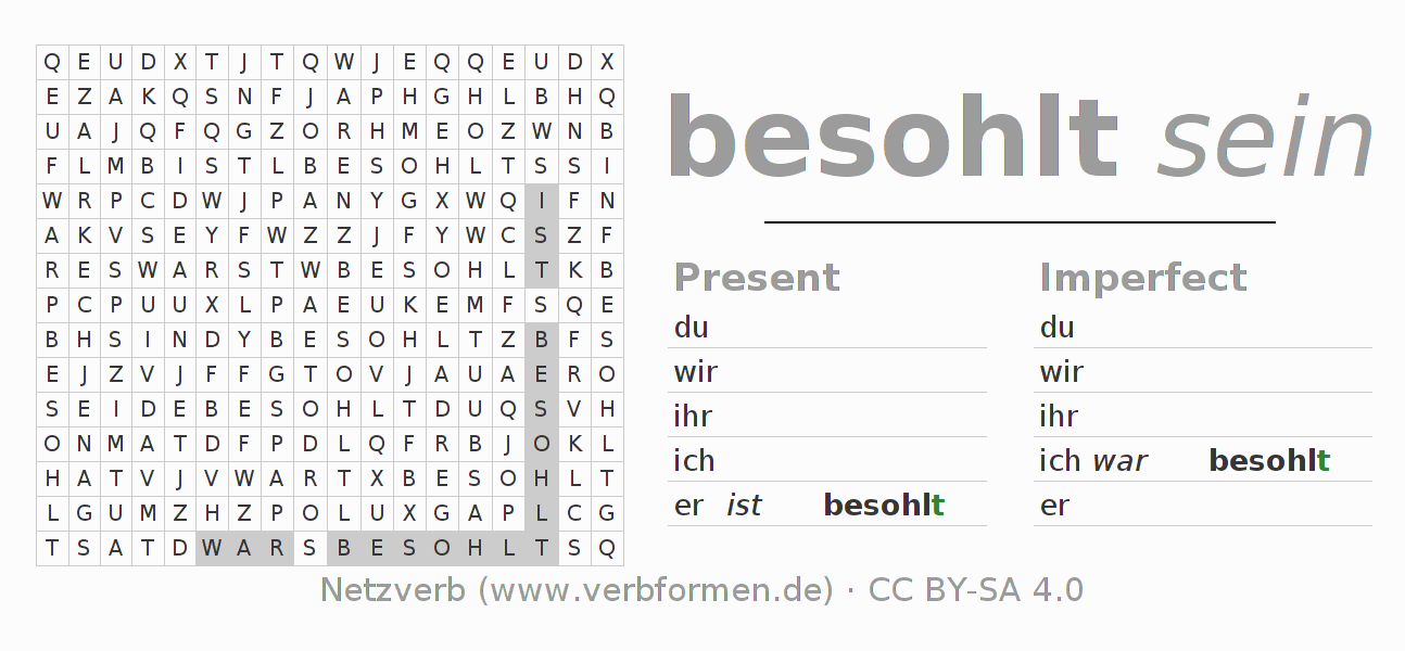 The word search puzzle for besohlen or short word search is used to playfully learn German conjugation. First of all, the individual verb forms of the verb besohlen must be created in order to find them in the letter grid. The reverse way is also possible. If one finds a flected verb in the search word puzzle, it is necessary to find out which verb form can be assigned. For printing and downloading, there is a PDF version or an image. There are also many more worksheets for the verb besohlen. All materials are available as Open Educational Resources (OER) under license CC BY- SA 4.0 and can be used free of charge.