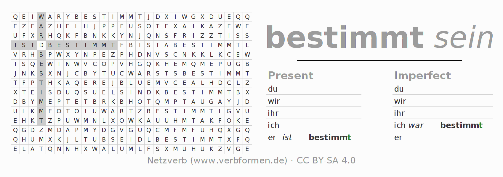 The word search puzzle for bestimmen or short word search is used to playfully learn German conjugation. First of all, the individual verb forms of the verb bestimmen must be created in order to find them in the letter grid. The reverse way is also possible. If one finds a flected verb in the search word puzzle, it is necessary to find out which verb form can be assigned. For printing and downloading, there is a PDF version or an image. There are also many more worksheets for the verb bestimmen. All materials are available as Open Educational Resources (OER) under license CC BY- SA 4.0 and can be used free of charge.