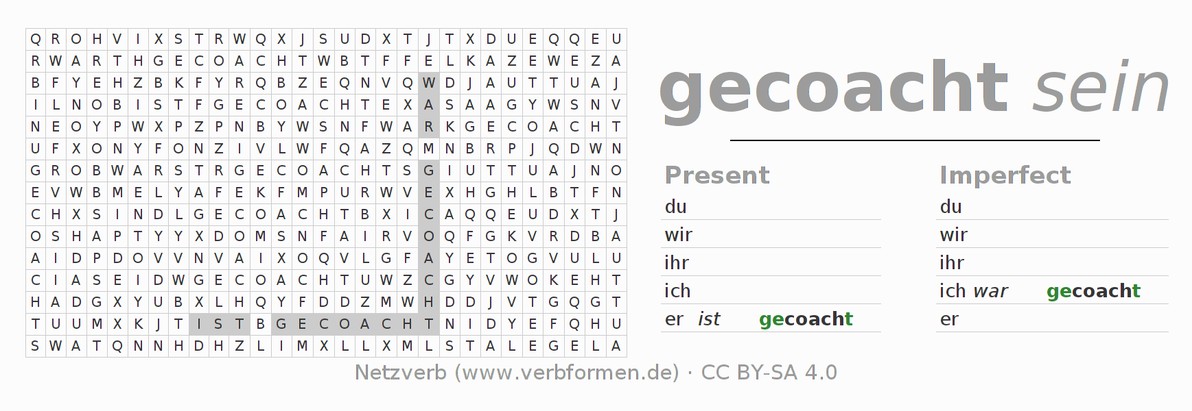 The word search puzzle for coachen or short word search is used to playfully learn German conjugation. First of all, the individual verb forms of the verb coachen must be created in order to find them in the letter grid. The reverse way is also possible. If one finds a flected verb in the search word puzzle, it is necessary to find out which verb form can be assigned. For printing and downloading, there is a PDF version or an image. There are also many more worksheets for the verb coachen. All materials are available as Open Educational Resources (OER) under license CC BY- SA 4.0 and can be used free of charge.