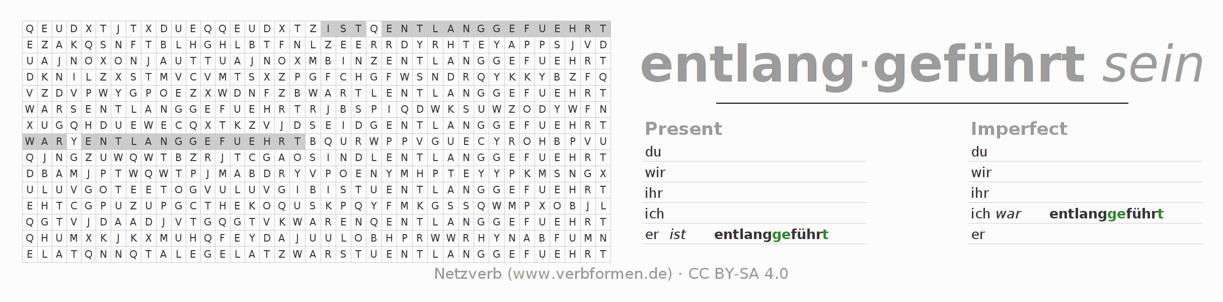 The word search puzzle for entlangführen or short word search is used to playfully learn German conjugation. First of all, the individual verb forms of the verb entlangführen must be created in order to find them in the letter grid. The reverse way is also possible. If one finds a flected verb in the search word puzzle, it is necessary to find out which verb form can be assigned. For printing and downloading, there is a PDF version or an image. There are also many more worksheets for the verb entlangführen. All materials are available as Open Educational Resources (OER) under license CC BY- SA 4.0 and can be used free of charge.