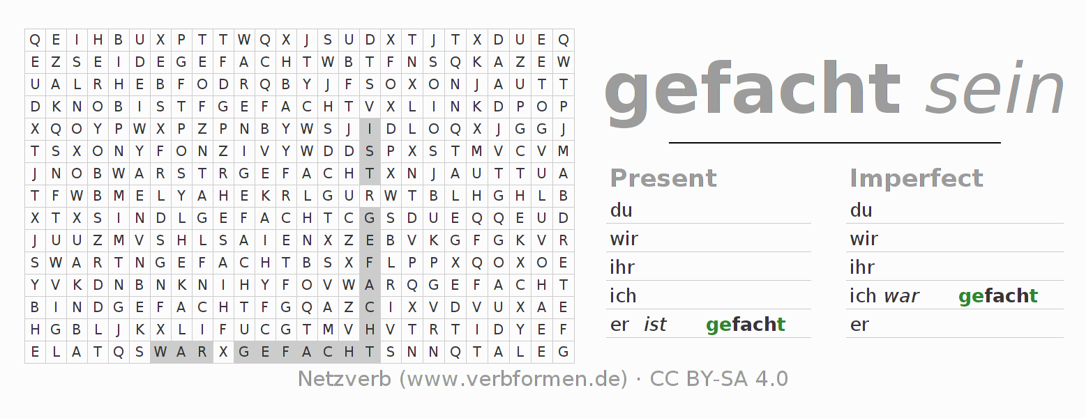Instruction: Form the verb fachen and find it in the puzzle. Or recognize the flected form of fachen in the riddle and assign it to the correct verb form. Umlauts and ß are described as oe, ae and ue an ss.The solution is at the bottom of the page.