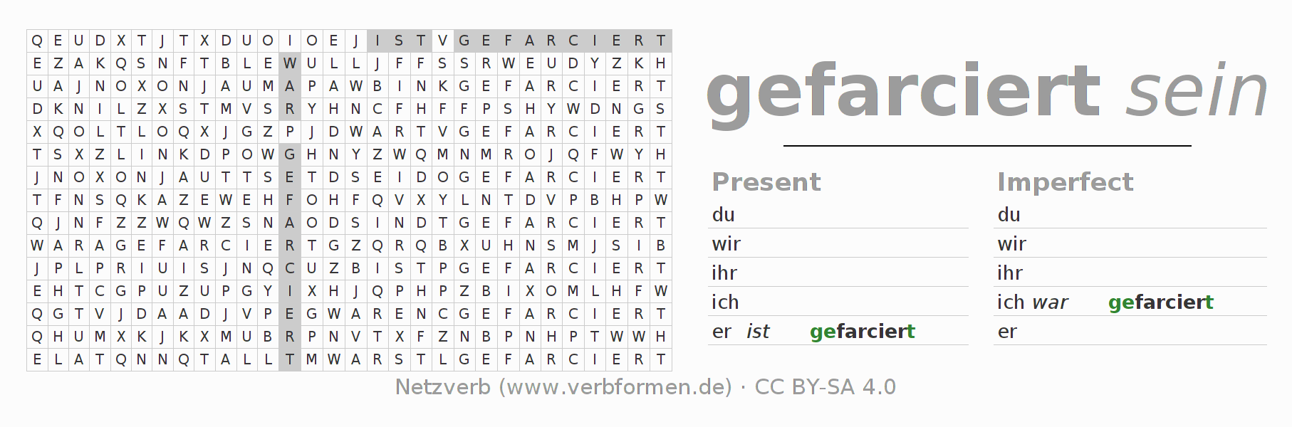 Word search puzzle for the conjugation of the German verb farcieren