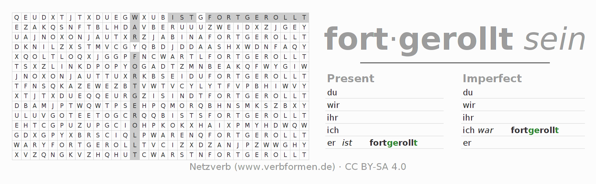 The word search puzzle for fortrollen or short word search is used to playfully learn German conjugation. First of all, the individual verb forms of the verb fortrollen (ist) must be created in order to find them in the letter grid. The reverse way is also possible. If one finds a flected verb in the search word puzzle, it is necessary to find out which verb form can be assigned. For printing and downloading, there is a PDF version or an image. There are also many more worksheets for the verb fortrollen. All materials are available as Open Educational Resources (OER) under license CC BY- SA 4.0 and can be used free of charge.
