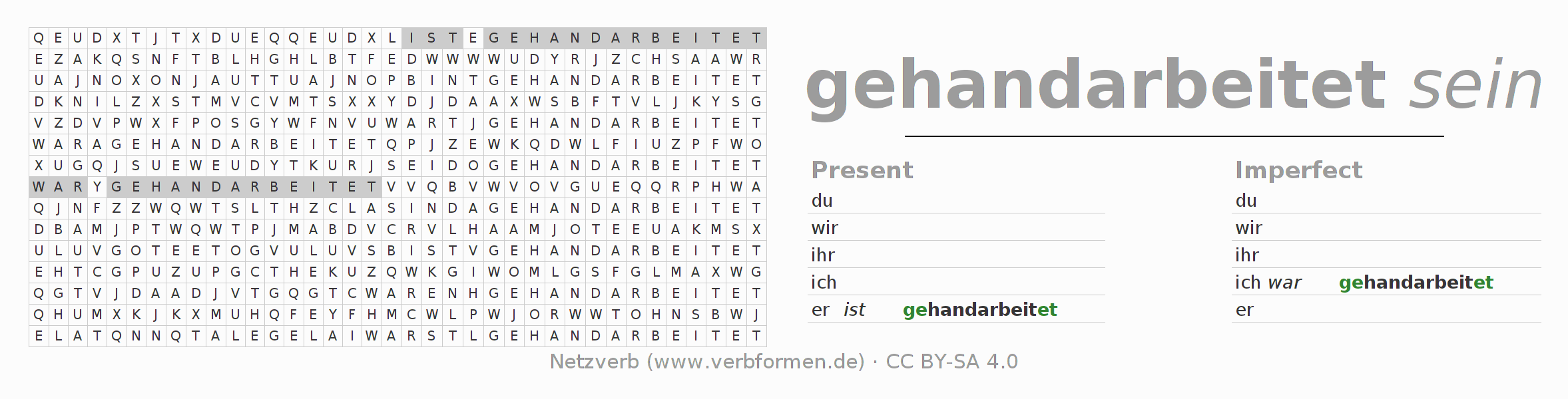 The word search puzzle for handarbeiten or short word search is used to playfully learn German conjugation. First of all, the individual verb forms of the verb handarbeiten must be created in order to find them in the letter grid. The reverse way is also possible. If one finds a flected verb in the search word puzzle, it is necessary to find out which verb form can be assigned. For printing and downloading, there is a PDF version or an image. There are also many more worksheets for the verb handarbeiten. All materials are available as Open Educational Resources (OER) under license CC BY- SA 4.0 and can be used free of charge.