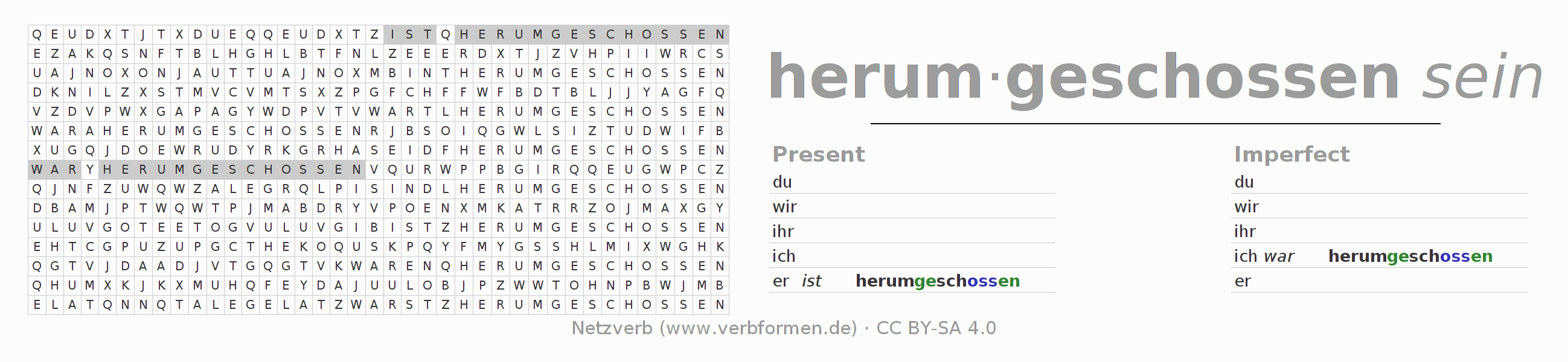 The word search puzzle for herumschießen or short word search is used to playfully learn German conjugation. First of all, the individual verb forms of the verb herumschießen (ist) must be created in order to find them in the letter grid. The reverse way is also possible. If one finds a flected verb in the search word puzzle, it is necessary to find out which verb form can be assigned. For printing and downloading, there is a PDF version or an image. There are also many more worksheets for the verb herumschießen. All materials are available as Open Educational Resources (OER) under license CC BY- SA 4.0 and can be used free of charge.