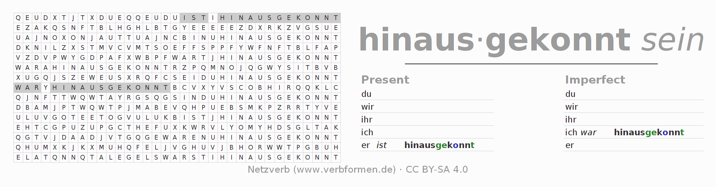 The word search puzzle for hinauskönnen or short word search is used to playfully learn German conjugation. First of all, the individual verb forms of the verb hinauskönnen must be created in order to find them in the letter grid. The reverse way is also possible. If one finds a flected verb in the search word puzzle, it is necessary to find out which verb form can be assigned. For printing and downloading, there is a PDF version or an image. There are also many more worksheets for the verb hinauskönnen. All materials are available as Open Educational Resources (OER) under license CC BY- SA 4.0 and can be used free of charge.