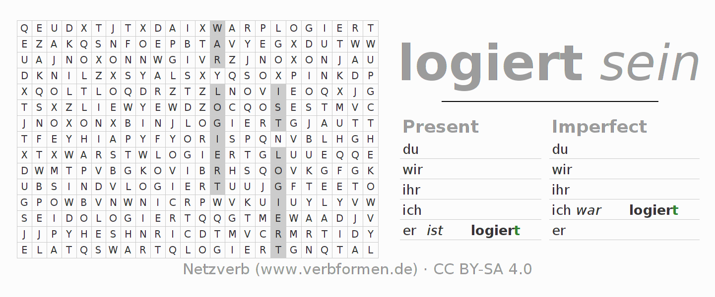 The word search puzzle for logieren or short word search is used to playfully learn German conjugation. First of all, the individual verb forms of the verb logieren must be created in order to find them in the letter grid. The reverse way is also possible. If one finds a flected verb in the search word puzzle, it is necessary to find out which verb form can be assigned. For printing and downloading, there is a PDF version or an image. There are also many more worksheets for the verb logieren. All materials are available as Open Educational Resources (OER) under license CC BY- SA 4.0 and can be used free of charge.