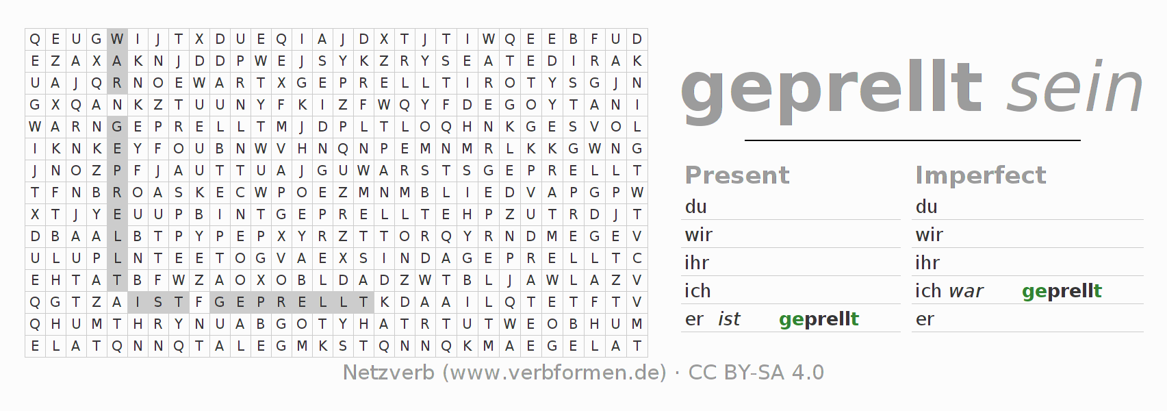 The word search puzzle for prellen or short word search is used to playfully learn German conjugation. First of all, the individual verb forms of the verb prellen (hat) must be created in order to find them in the letter grid. The reverse way is also possible. If one finds a flected verb in the search word puzzle, it is necessary to find out which verb form can be assigned. For printing and downloading, there is a PDF version or an image. There are also many more worksheets for the verb prellen. All materials are available as Open Educational Resources (OER) under license CC BY- SA 4.0 and can be used free of charge.