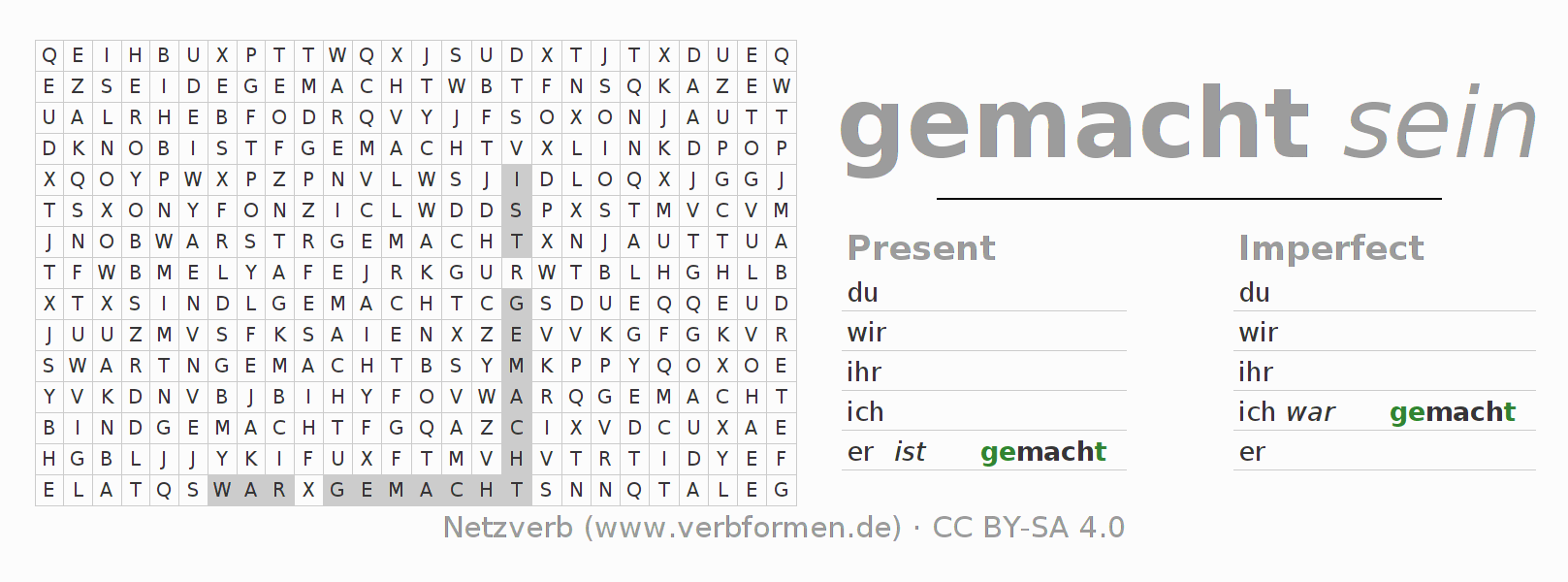 Instruction: Form the verb sich machen and find it in the puzzle. Or recognize the flected form of sich machen in the riddle and assign it to the correct verb form. Umlauts and ß are described as oe, ae and ue an ss.The solution is at the bottom of the page.