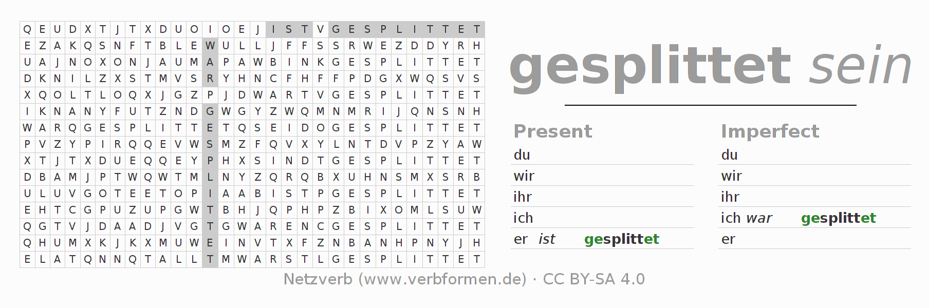 Instruction: Form the verb splitten and find it in the puzzle. Or recognize the flected form of splitten in the riddle and assign it to the correct verb form. Umlauts and ß are described as oe, ae and ue an ss.The solution is at the bottom of the page.